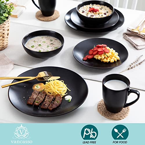 Vancasso MODA Servizio da tavola, set combinato 16 pezzi in porcellana con piatto piano, piatto da dessert, ciotola di cereali e tazza, servizio da tavola nero, servizio per 4