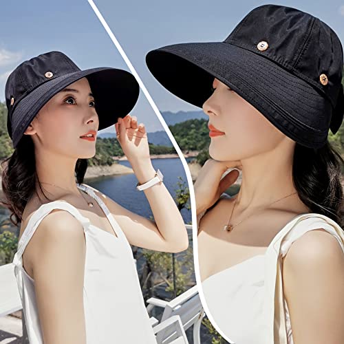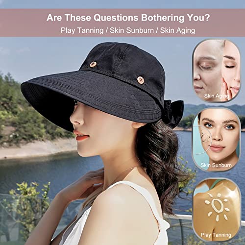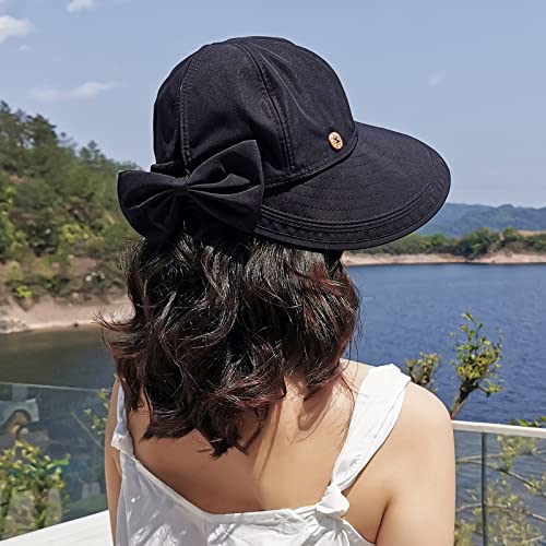 VanderHOME Cappello da Spiaggia Donna Pieghevole Anti-UV Traspirante Cappello da Sole Donna con Visiera Cappello Donna Estivo a Tesa Larga con Bowknot e Sottogola Staccabile, Nero