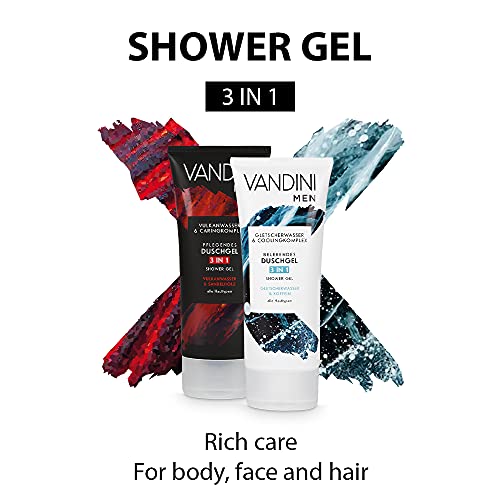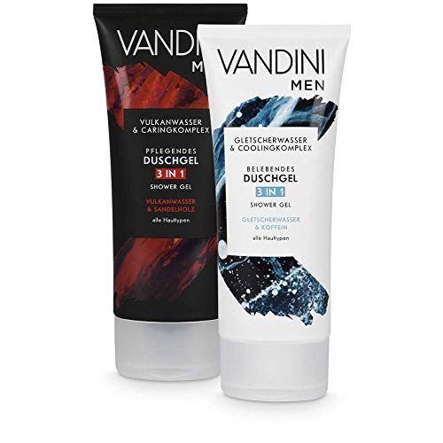 CONSEGNA contiene 1 set di gel doccia VANDINI con 200 ml di gel doccia rinvigorente 3in1 con acqua di ghiacciaio e caffeina e 200 ml di gel doccia nutriente 3in1 con acqua vulcanica e legno di sandalo