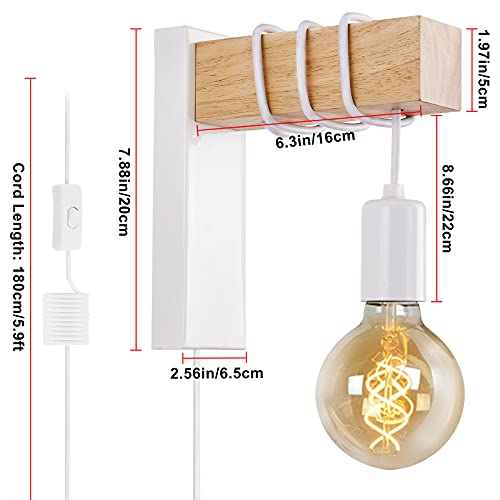 VANSINTEK Industrial Plug in Lampada da Parete per Camera da letto Comodino Appliques Illuminazione A Parete E27 Lampada Da Parete con Plug in Cord Legno Moderno Bianco con On/Off Interruttore Decor
