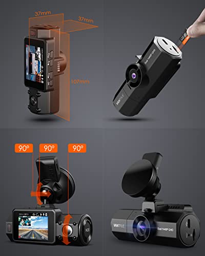 【QHD Dual 1440P con GPS】 Basata su un potente processore, la fotocamera Vantrue N2S può registrare simultaneamente a 1440P + 1440P. La fotocamera anteriore ha un massimo di WQH 3840x 2160P a 25 fps. La fotocamera frontale 155 ° F1.4 può filmare tutte le corsie, riducendo le aree cieche durante la registrazione. Il 165 ° F1.8 posteriore riprende un video chiaro della cabina. Il supporto GPS integrato può monitorare il percorso e la velocità. Fornisce le prove, scorta per una guida sicura.