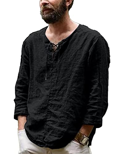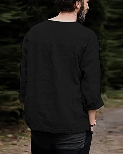 VANVENE Camicia da uomo in cotone e lino casual a maniche lunghe Henley Pullover Top, Nero, M