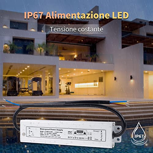 * IMPERMEABILE - Adattatore LED a bassa tensione per esterni. L'alloggiamento in alluminio con classificazione IP67 resistente agli agenti atmosferici è progettato per proteggere l'unità da alti livelli di infiltrazione di polvere e di acqua sia per condizioni di lavoro interne/esterne.