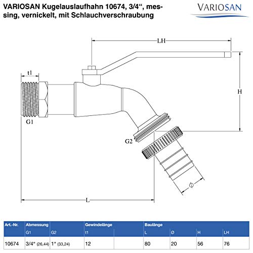 VARIOSAN rubinetto a sfera 10674, 3/4", ottone, nichelato, con raccordo per tubo flessibile