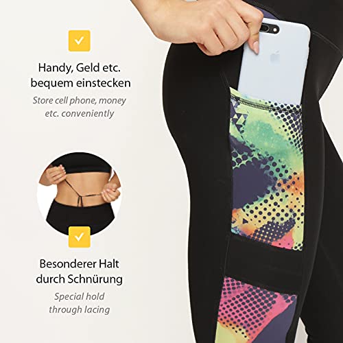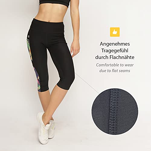 Variosports Sport Capri 3 4 Donna con 2 Scomparti Laterali per Telefono Cellulare, Chiavi, Carta di Credito e Co. Fitness Sport Collant Sportivo Brazil Modello Yoga Noir