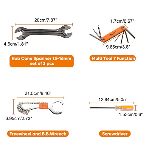 KIT DI RIPARAZIONE BIYCLE: include estrattore per rivetti a catena, chiave per cappuccio antipolvere, chiave per raggi O, kit di riparazione per pneumatici patch senza colla, estrattore manovella, multiutensile 7 funzioni, chiave aperta 8/10 mm, ruota libera e chiave B.B., chiave a brugola da 8 mm + testa quadrata, cacciavite, Set di 2 chiavi a cono per mozzo 13-16 mm, set di leve per pneumatici, dispositivo di rimozione della ruota libera e strumento B.B