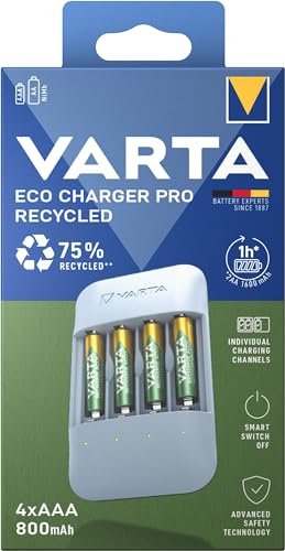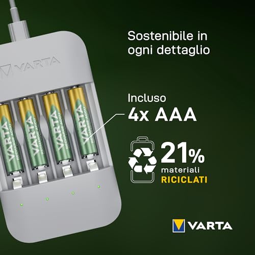 Contenuto della fornitura: VARTA Eco Charger Pro Recycled incl. Cavo di ricarica USB di tipo C incluso. 4x AAA 800 mAh Recharge Accu Recycled