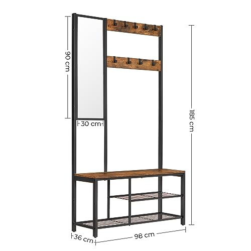 VASAGLE Appendiabiti, Mobile Ingresso con Ganci, Specchio, Panca Scarpiera e Ripiani, 36 x 98 x 185 cm, Corridoio Camera da Letto Salotto, Marrone Vintage e Nero HSR050B01