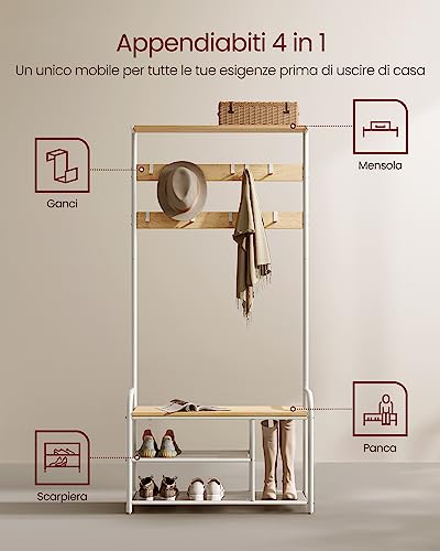 VASAGLE Appendiabiti con Scarpiera, Mobile Ingresso con 9 Ganci Rimovibili, Panca, Mensola, 30 x 85 x 180,5 cm, Corridoio Camera da Letto Appartamento, Moderno, Rovere e Bianco HSR409W09