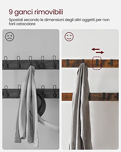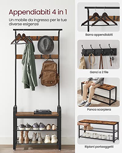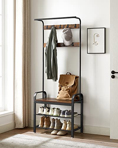 VASAGLE Appendiabiti con Scarpiera, Mobile da Ingresso con Panca, 4 in 1, 9 Ganci Rimovibili, Barra Attaccapanni, Entrata Corridoio, 33,7 x 72 x 183 cm, Industriale, Marrone Vintage e Nero HSR40B