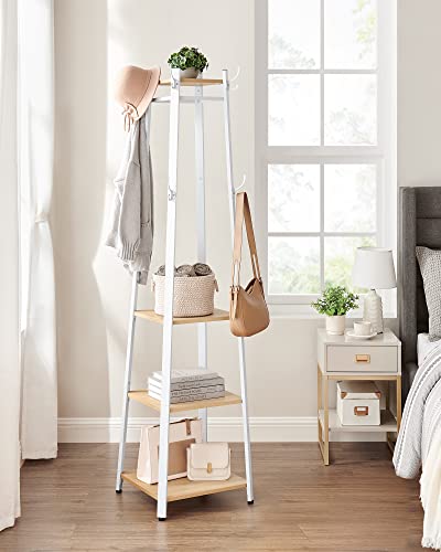 VASAGLE Appendiabiti da Terra, Attaccapanni con 8 Ganci Doppi, 4 Ripiani, Barra Appendi Abiti Cappotti Cappelli Borse, Struttura in Metallo, Ingresso Camera da Letto, Bianco e Rovere LCR080W09