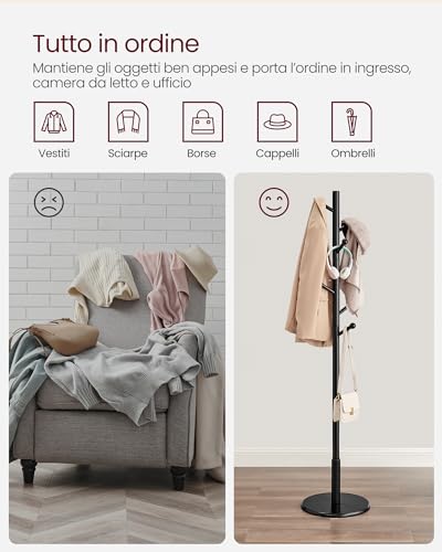 VASAGLE Appendiabiti da Terra, Attaccapanni in Legno con 7 Ganci, 3 Altezze Regolabili, Appendi Abiti Cappotti Cappelli Borse, per Ingresso Camera da Letto, Nero RCR007P33