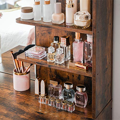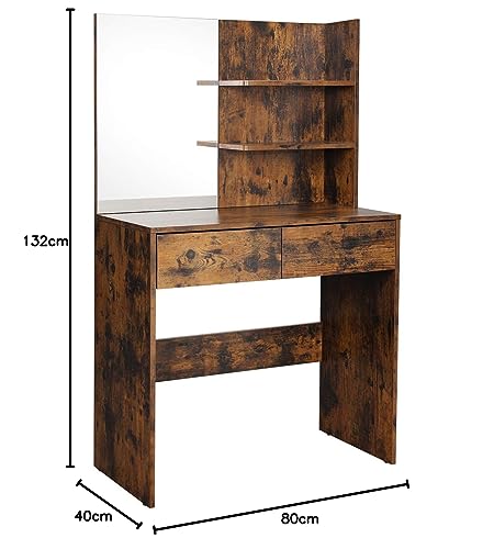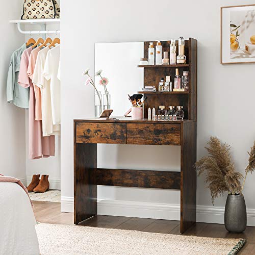 VASAGLE Toeletta con 2 Cassetti, Tavolo da Trucco con Specchio, Postazione Trucco, Ripiani Aperti con Angoli Arrotondati, per Camera da Letto, Marrone Vintage RDT116X01