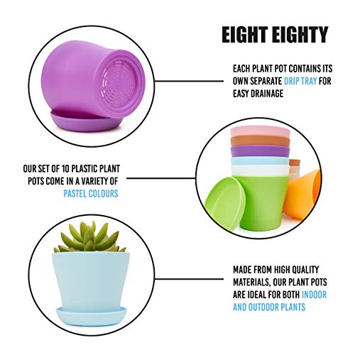 Set di 10 vasi per Piante in plastica, Colori Pastello Assortiti da 10 cm - Include vaschette di Raccolta/piattini Separati con Fori di drenaggio - Ideale per Piante da Interno e da Esterno