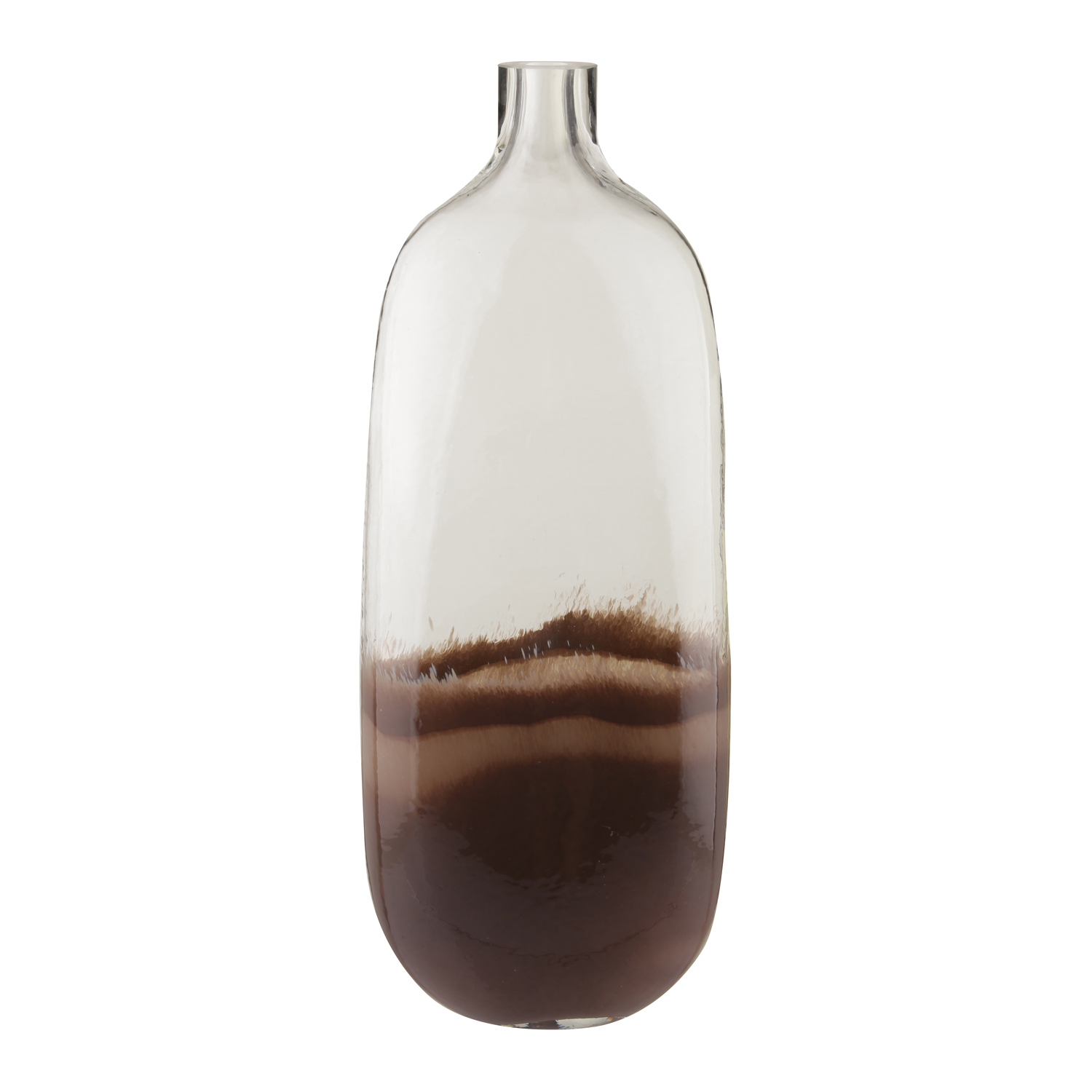 Un vaso dalle linee moderne e bombate caratterizzato da un'imboccatura stretta adatta per un fiore a stelo lungo o piccole composizioni fresche o secche. Il design elegante bicolore trasparente e marrone lo rende un elemento d'arredo perfetto anche da utilizzare da solo arricchendo librerie, mensole e altri piani di soggiorno e camera da letto. Aggiungerà un tocco raffinato e colorato ai tuoi ambienti interni. Dimensioni: 19xh50 cm.