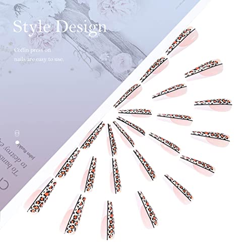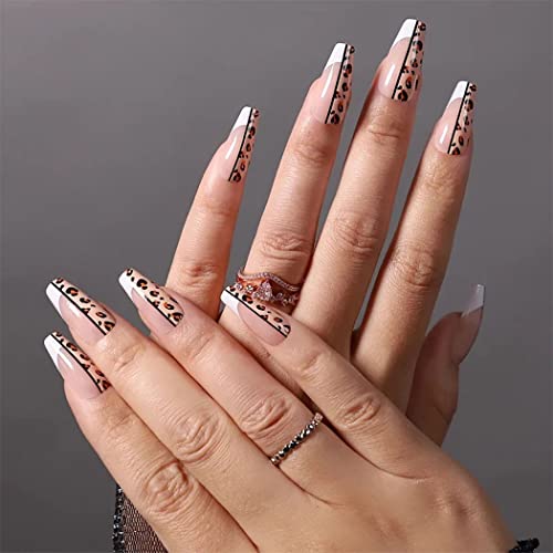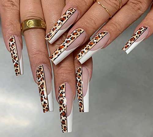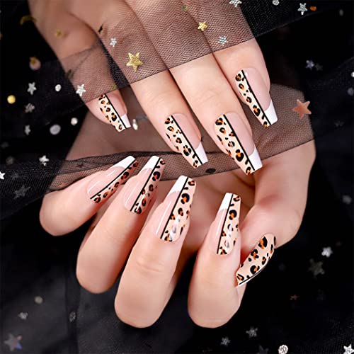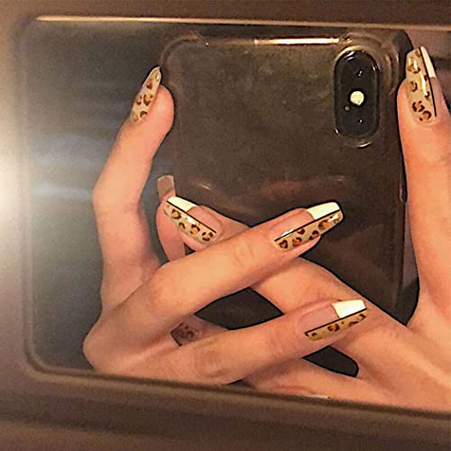 Vatocu Unghie finte lucide per bara Unghie finte francesi lunghe Stampa leopardata marrone Stampa sulle unghie Stick acrilico bianco sulle unghie per donne e ragazze (24 pezzi)