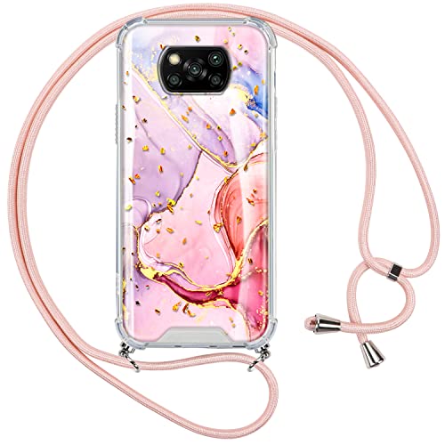 Vauki Cover Xiaomi Poco X3 NFC/X3/X3 Pro con Cordino,Trasparente Marmo Glitter Antiurto Brillantini Tracolla Laccio Collana Custodia,Silicone Bumper Case per Xiaomi Poco X3 NFC/X3 Pro,Rose