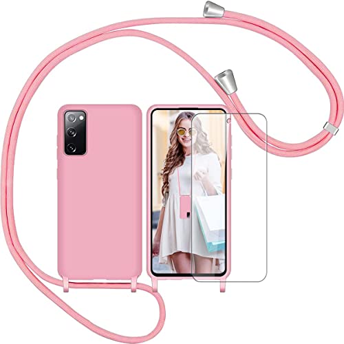 Vauki Custodia con Cordino per Samsung Galaxy S20 FE 5G/S20 Lite 6.5", 1 Pezzi Pellicola Protettiva in Vetro Temperato, Antiurto Silicone Morbido Case con Regolabile Collana e Laccio Tracolla, Rosa