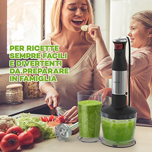 VAVA Frullatore ad Immersione Multifunzione 3-in-1 (Tritatore Facile da Utilizzare con una Mano, Controllo Velocità Graduale, Senza BPA, Acciaio Inossidabile, Design Antiscivolo, Lavabile in Lavastoviglie)