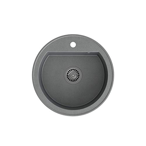 Con connettore per lavatrice o lavastoviglie. Il lavello da cucina in granito è progettato per l'installazione complanare. Adatto per un sottolavello da 50 cm. Dimensione del lavello: diametro interno di 43 cm, diametro esterno di 51 cm, profondità di 18 cm. Diametro del foro: 35 mm. Foro per rubinetto preforato.