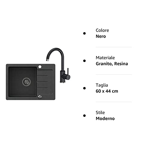 Con pratico scolapiatti per riporre le stoviglie. Con attacco per lavatrice o lavastoviglie Il lavello da cucina in granito è predisposto per installazione a filo. Il lavabo può essere installato in modo reversibile (sinistro o destro). Adatto per basi da 45 cm. Dimensioni della vasca: 60 x 44 cm, profondità della vasca: 17 cm, i fori per i raccordi sono preforati.