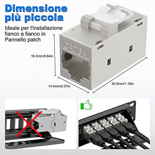 TRASMISSIONE STABILE: Il Keystone RJ45 Cat6A ha un alloggiamento schermato in lega di zinco e contatti S per ridurre le interferenze EMI / RFI e garantire una trasmissione stabile del segnale. Keystone coupler cat6a fornisce velocità Internet più veloci fino a 10Gbps