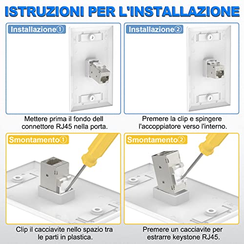 ARRANGO & PROLUNGA DI CAVO RETE: L'accoppiatore Keystone rj45 è conveniente da usare con piastre murali standard e patch panel per un ambiente più pulito. Collegare direttamente il connettore rj45 per una rapida installazione senza attrezzi. Viene utilizzato anche per collegare 2 cavi di rete, estendendo la lunghezza dei cavi. Adatto per dispositivi con porte RJ45 standard come PC, Hub, Router, Switch, ecc