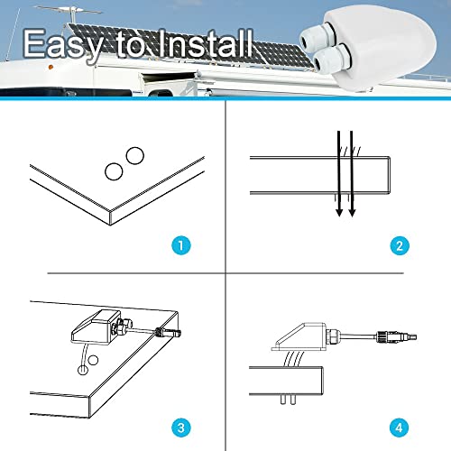 【Installazione semplice】: non è necessario praticare fori sul tetto o sul ponte del camper durante l'installazione. Basta infilare il cavo solare attraverso i supporti da tetto e stringere il cappuccio. Il design della superficie curva del condotto del tetto può ridurre la resistenza al vento, il bordo più ampio è facile da installare con la colla. (Il fondo ha delle scanalature. Adatto per l'incollaggio e l'impermeabilizzazione. Per il montaggio è necessario un adesivo adatto.)