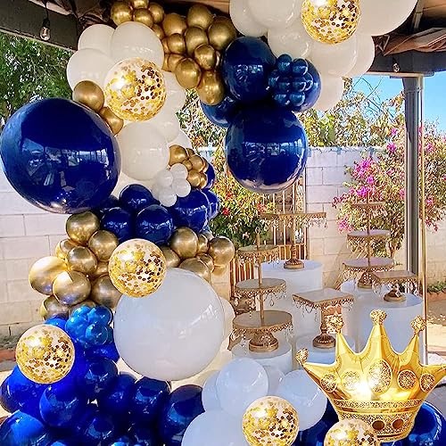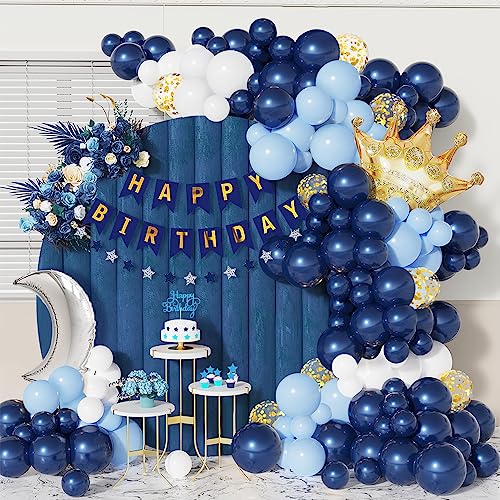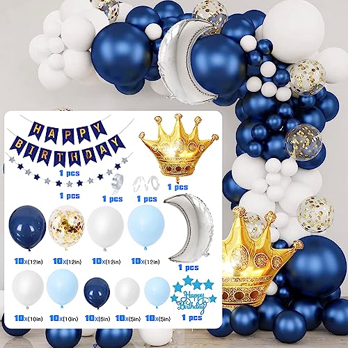 Perfect Kit Arco Palloncini Blu Navy: include 1 palloncino con corona d'oro da 18", 1 palloncino con luna d'argento da 18". Banner di buon compleanno, decorazione per torta, 12" (palloncino blu*10, palloncino bianco*10, palloncino blu navy*10, coriandoli oro palloncini * 10), 10 pollici (palloncini blu * 10, palloncini bianchi 10 pollici * 10) 5 '' (palloncini blu * 10, palloncini bianchi * 10, palloncini blu navy * 10), 1 nastro a palloncino, 1 catena a palloncino