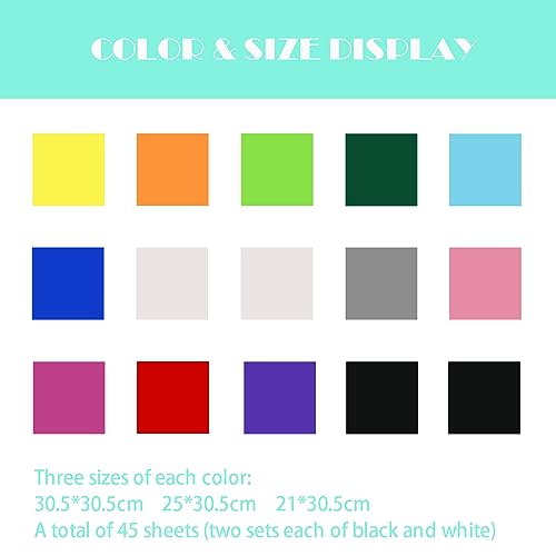 【Il pacchetto include】-Riceverete 45 pellicole per lettering. Include 13 colori diversi (uno extra nero e uno bianco) e ogni colore ha tre specifiche diverse (30,5*30,5 cm 25*30,5 cm 21*30,5 cm). I diversi colori e le diverse specifiche possono soddisfare le diverse esigenze di voi e della vostra famiglia.