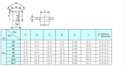 Facile installazione: Con una dimensione del filetto di M4 x 0,7 mm e una dimensione del foro di 6 mm, questi dadi a rivetto sono progettati per un'installazione semplice. Basta perforare un foro, inserire il dado a rivetto e stringere il dado di bloccaggio con l'apposito utensile per rivetti fornito.
