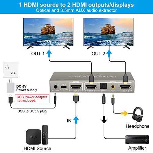 【HDMI Splitter Audio Extractor 4K@60hz 】Splitter HDMI 1 in 2 con estrattore audio, può DUPLICARE / MIRROR un segnale HDMI a due display HDMI contemporaneamente ed estrarre segnali audio da qualsiasi sorgente HDMI che senza uscita audio dedicata.* Nota: Si prega di utilizzare il cavo HDMI PREMIUM ad alta velocità durante la visione di film 4K60 HDR.