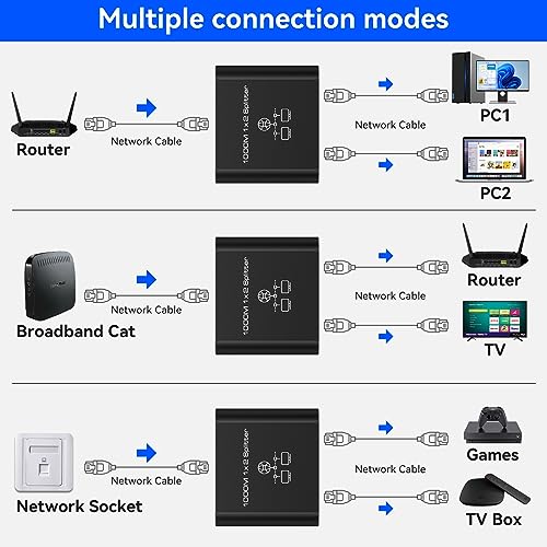 【Plug and Play】Questo Hub di rete a 2 Porte può essere utilizzato senza riavviare il computer, plug and play, non è necessario configurarlo, la trasmissione del segnale di due set di cavi non interferisce l'uno con l'altro, si collega direttamente alla connessione del cavo di rete, due computer possono accedere a Internet contemporaneamente. Questo Splitter di Rete Gigabit è un'apparecchiatura di rete ad alte prestazioni, in grado di soddisfare le vostre esigenze di connessione multidispositivo.
