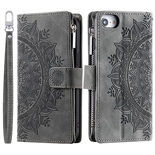 VEEMOS Custodia a Portafoglio per iPhone SE 2022/2020, iPhone 7/8 con Motivo Floreale Scomparti per Carte di Credito Custodia in Pelle - Grigio