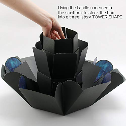 Design creativo: con la scatola a 6 lati e 5 livelli si possono posizionare quasi 100 foto di diverse dimensioni in una scatola grande per rendere la scatola un oggetto di presentazione per le foto. Utilizzando le maniglie sotto la piccola scatola (cioè il secondo strato), è possibile impilare i tre pezzi superiori della scatola in una forma a torre a tre piani per dare alla scatola una sensazione tridimensionale e creativa. Cercate "VEESUN Tower Explosionbox" su YOUTUBE.