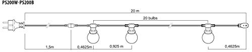 Cordoniera di colore bianco, 20 portalampada e27, lunghezza totale 20 mt, distanza tra ogni portalampada 0,925 mt;