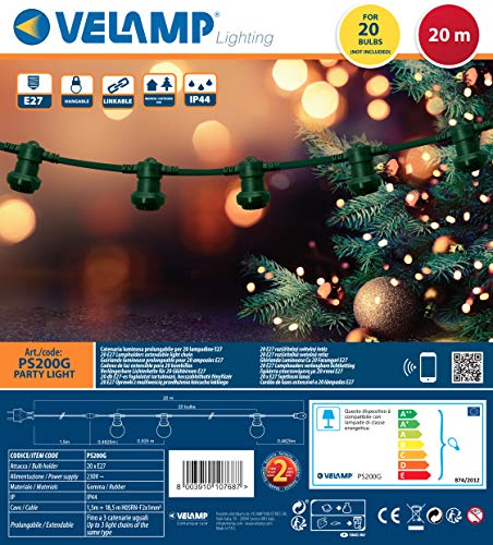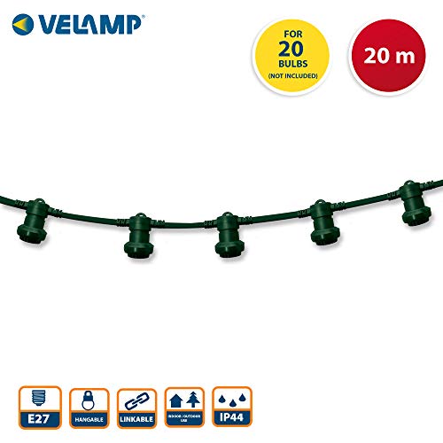 Velamp Cordoniera 20 portalampada E27. Catena luci Interno ed Esterno. Lunghezza: 20m. Prolungabile, appendibile. Perfetta per Natale, Giardino, Verde
