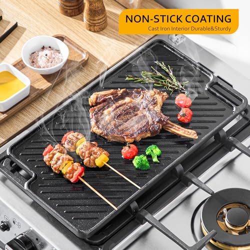 Velaze Bistecchiera in Ghisa con Maniglie, Reversibile, Antiaderente, Grill Piastra con Doppia Faccia, Adatta a Tutti Piani Cottura, Induzione e Forno - Nero (48x28x5 cm)