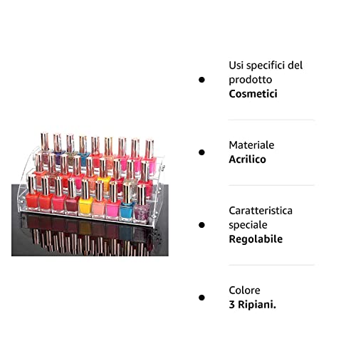 Alta qualità: alta qualità: scaffale per smalto acrilico di qualità professionale con ripiani trasparenti e ringhiera per fornire la massima visibilità per la tua collezione di smalti. Elevata durezza e lucentezza della superficie, ecologico.