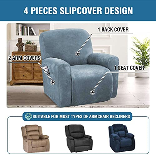 Velluto Copripoltrona Relax Elasticizzato, 4 Pezzi Morbido Fodera per Poltrona con Tasca Laterale Antiscivolo Lavabile Sofa Protettore per Soggiorno-Blu-C-reclinabile