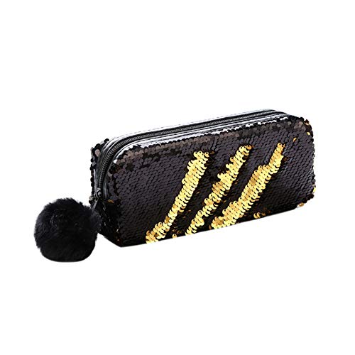 VelvxKl Fashion Cosmetic Pouch Sequin Pompom Decor Grande capacità Sacchetto della matita Organizzatore di cancelleria Black + Golden