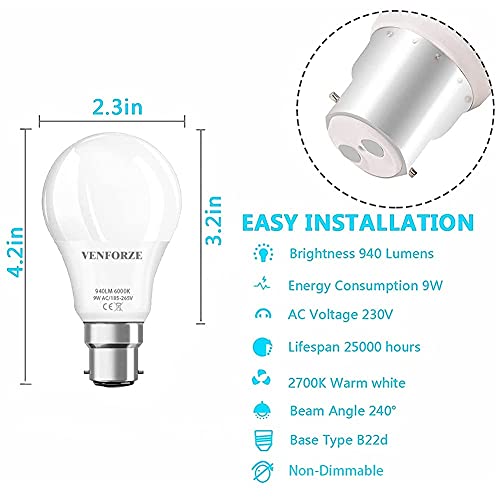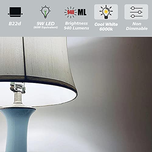 Venforze Lampadine a baionetta, 9 W (equivalente a 60 W) 6000 K, bianco freddo B22, lampadine a baionetta 940 lm, A60, non dimmerabili, BC GLS a risparmio energetico, confezione da 6