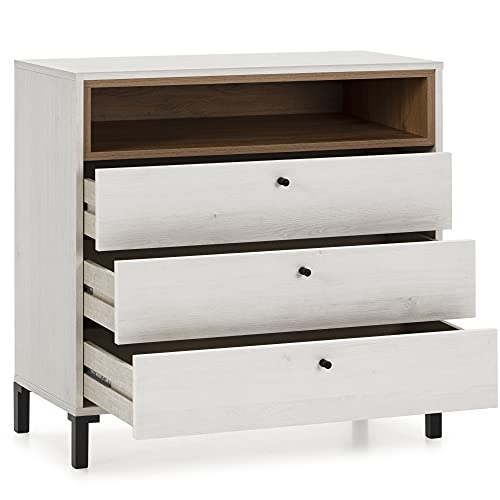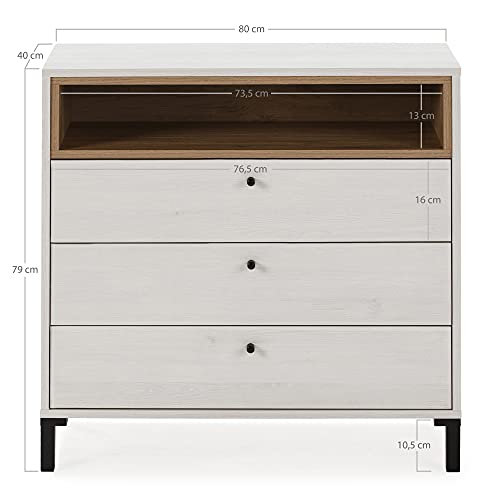 VS Venta-stock Cassettiera Javea 3 cassetti e 1 nicchia, Color Bianco e Legno, 80 cm (Larghezza) 40 cm (profonditá) 79,5 cm (Altezza)