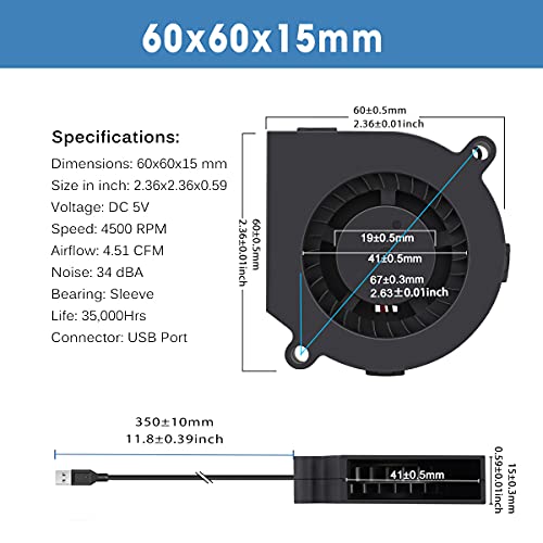 Specifica: Dimensioni: 60 x 60 x 15 mm. Velocità: 4500 giri/min, flusso d'aria: 4,51 CFM, cuscinetto: manicotto, connettore: porta USB. Tempo di funzionamento: 35.000 ore a 25 ℃. Rumore: 34 dBA