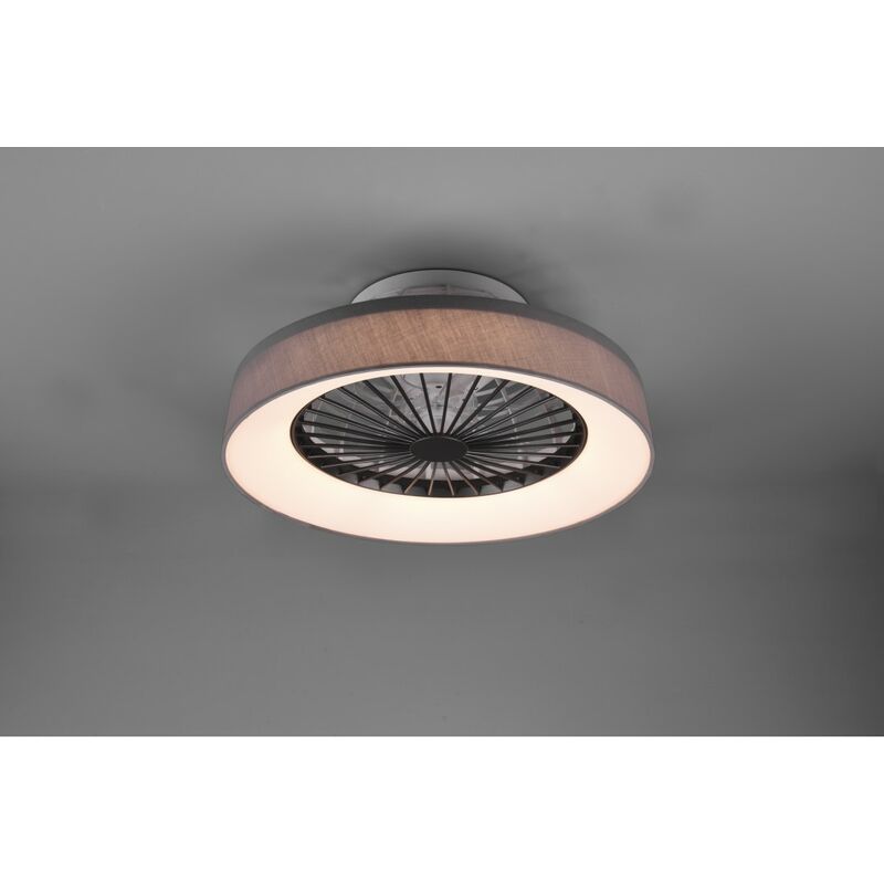 FARSUND di Trio Lighting é un ventilatore da soffitto rotondo con struttura in plastica grigia e diffusore in tessuto in tinta con la struttura, diametro 47 cm. Dotata di modulo led integrato SMD LED 30 watt, resa luminosa 2200 lumen, 3000k - 6500k (luce calda, fredda e naturale). Dimmer integrato. Tramite il pratico telecomando in dotazione é possibile accedere a diverse funzioni come la regolazione di intensità e temperatura colore della luce (3000k - 4000k - 6500k), l'attivazione luce notturna e il timer per l'accensione/spegnimento automatico in orari prestabiliti. Non compatibile con dimmer esterno. La velocità delle pale può essere impostata a 3 diversi livelli. Dal design moderno e dalle molteplici funzioni, questo ventilatore oltre a raffrescare l'ambiente permette di illuminare la stanza in modo totalmente personalizzato, perfetto per la camera da letto, il soggiorno living ma anche per la ventilazione di locali commerciali e uffici. Disponibile anche la versione di colore