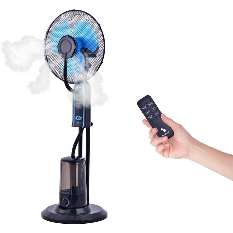 Ventilatore con funzione nebulizzazione per donare immediata freschezza a qualsiasi ambiente. Pannello di controllo con 3 velocità e 3 modalità di ventilazione (normale, brezza, nottura) e timer fino a 7,5 ore programmabile anche dal comodo telecomando. Il prodotto è dotato di oscillazione orizzontale automatica ad ampio raggio e di un serbatoio di acqua da 3 litri.