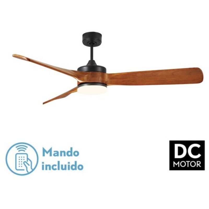 Ventilatore DC della serie ORIENTE in metallo, legno e policarbonato, di colore NERO con tre pale color ROVERE. Ha sei velocità regolabili con un motore DC. Tecnologia LED integrata dalla potenza di 26W, con 3 TEMPERATURE LUCE REGOLABILI (3000-40