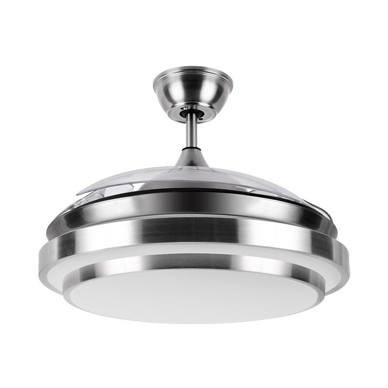 Ventilatore DC serie IBE in metallo, policarbonato e ABS, di colore NICKEL con tre resistentissime pale DEPLOYABLE in ABS trasparente. Ha sei velocità regolabili. Tecnologia LED integrata dalla potenza di 72W, con 3 TEMPERATURE LUCE (3000-4000-6000K) e 6120 lumen. Controllo dell'aria estiva o invernale. La sua misura è di 34/49X50 centimetri con le lame ripiegate e 34/49X108 centimetri con le lame spiegate. Include due reggisella da 10 e 25 centimetri. Telecomando INCLUSO con MEMORIA COLORI incorporata e TIMER 1/2/4 H. Modello disponibile anche nel colore cuoio. >