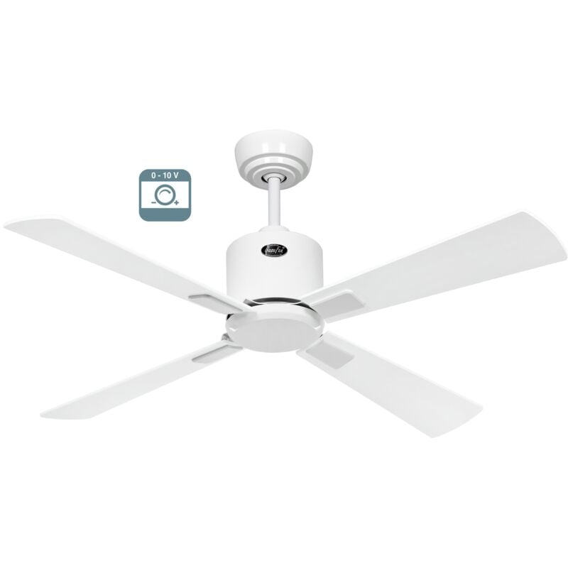 CasaFan ECO NEO III 103 WE-WN/SI 0 - 10 V, ventilatore da soffitto a risparmio energetico, Ø 103 cm, interfaccia 0-10 V, alloggiamento laccato bianco, 4 lame reversibili in legno (montabile opzionalmente 2,3,4), 100-240 V 50-60 Hz, motore DC/EC 2,5-16 W, incl. telecomando wireless (motore 6 livelli, avanti/indietro - estate/inverno -, timer di spegnimento, luce accesa/spenta/DIMM) e supporto a parete, livello rallentatore, velocità max. 30-208 giri/min, incl. 2 aste per soffitto (150 e 80 mm), distanza soffitto - anta 360 mm (290 mm con asta a soffitto corta, 270 mm con asta a soffitto accorciata), montaggio su pendenze fino a 23°, motore e anta bilanciati, per ambienti fino a 13 m², accessori come luci, ante di ricambio e aste per soffitti più lunghe disponibili