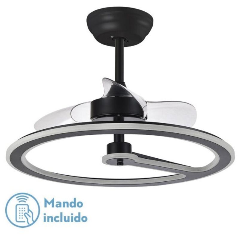 Ventilatore della serie CHOM Colore NERO, con tre pale trasparenti e 6 velocità. Motore a corrente continua. Realizzato in metallo, ABS e policarbonato. Design molto moderno e originale. Tecnologia LED integrata con 110 watt di potenza, 93
